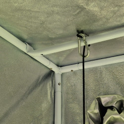 Cette barre se positionne facilement sur les tubes horizontaux de la chambre de culture, sans perçage ni modification de la structure. Elle crée un point d’accroche stable pour l’utilisation de poulies, Easy Rolls, chaînes ou suspentes réglables.